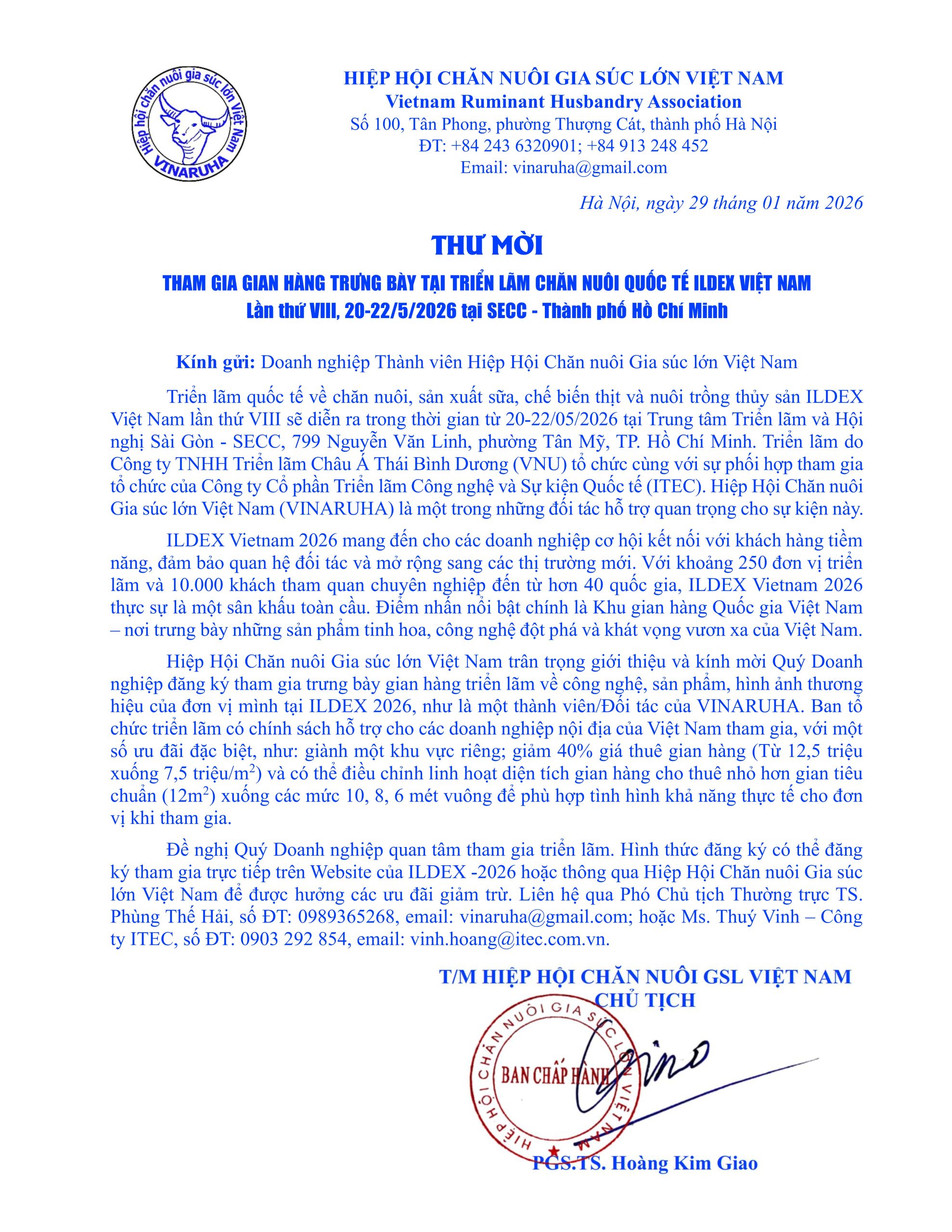 THƯ MỜI THAM GIA GIAN HÀNG TRƯNG BÀY TẠI TRIỂN LÃM CHĂN NUÔI QUỐC TẾ ILDEX VIỆT NAM LẦN THỨ VIII, 20-22/5/2026 TẠI SECC – THÀNH PHỐ HỒ CHÍ MINH