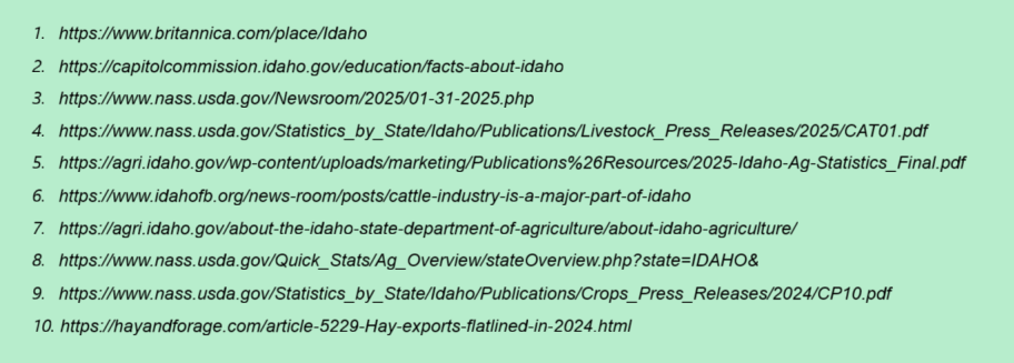 Ngành chăn nuôi gia súc (bò sữa, bò thịt) có vai trò quan trọng trong nền nông nghiệp của bang Idaho. Năm 2025, đàn bò đạt 2,49 triệu con chiếm khoảng 2,9% tổng đàn bò của Hoa Kỳ (86,7 triệu con), trong đó đàn bò sữa đạt 663.000 con chiếm 7,1% tổng đàn bò sữa Hoa Kỳ (9,35 triệu con). Với nhiều vùng đồng cỏ rộng và nguồn thức ăn phong phú, bang Idaho phát triển tất cả các phân khúc của ngành gia súc từ sản xuất giống, nuôi bò sinh sản, bò hậu bị, bê con, vỗ béo bò thịt, chế biến sản phẩm …. (nass.usda.gov; agri.idaho.gov; idahofb.org). Bang Idaho cũng là khu vực nổi tiếng về cỏ alfalfa để làm thức ăn gia súc, đứng đầu về sản lượng cỏ khô và đứng thứ hai về tổng sản lượng cỏ alfalfa của Hoa Kỳ. Năm 2024, diện tích trồng cỏ alfalfa đạt khoảng 380.000 ha, năng suất trung bình đạt 4,6 tấn/ha, sản lượng cỏ khô đạt 3,85 triệu tấn. Cỏ khô alfalfa của bang Idaho được xuất khẩu đi nhiều nước trên thế giới như Trung Quốc, Nhật Bản, Hàn Quốc, Saudi Arabia, Đài Loan … và đạt sản lượng xuất khẩu 2,13 triệu tấn trong năm 2024 (agri.idaho.gov; nass.usda.gov; hayandforage.com). Tài liệu tham khảo: